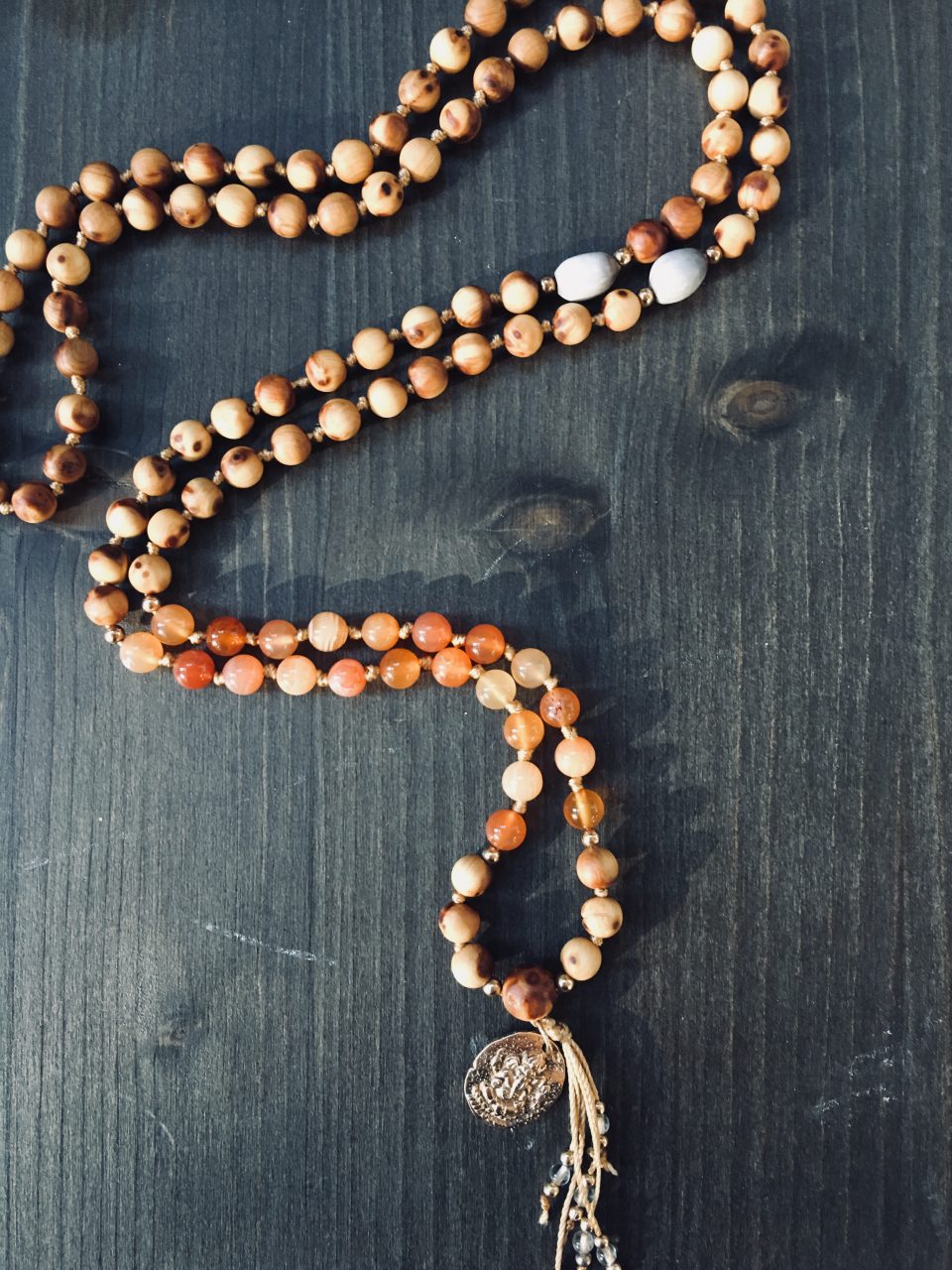 | Material | Cypress Wood, Silk, Carnelian, Gold-Filled |
